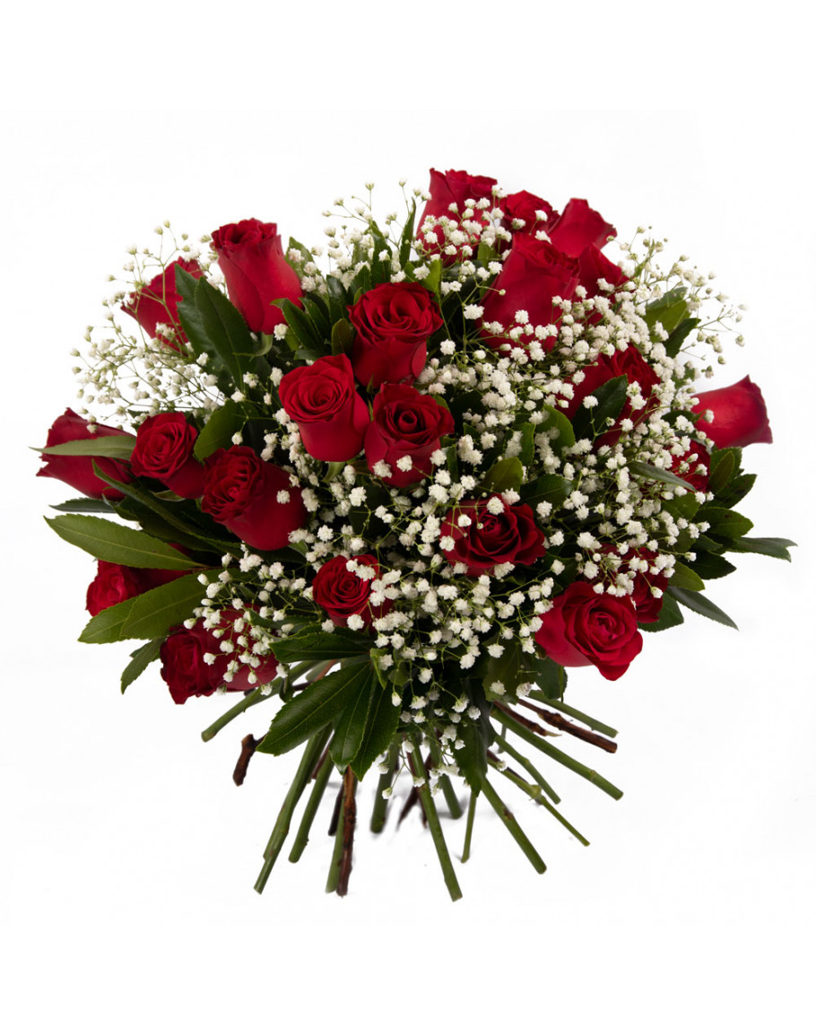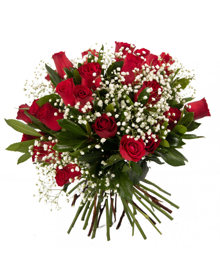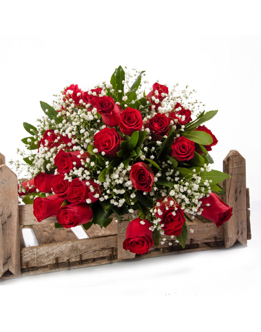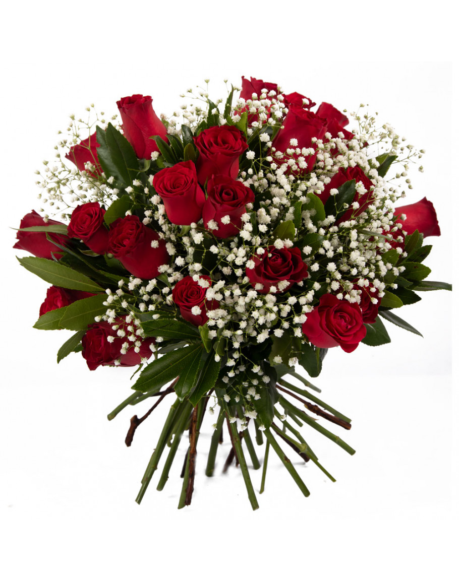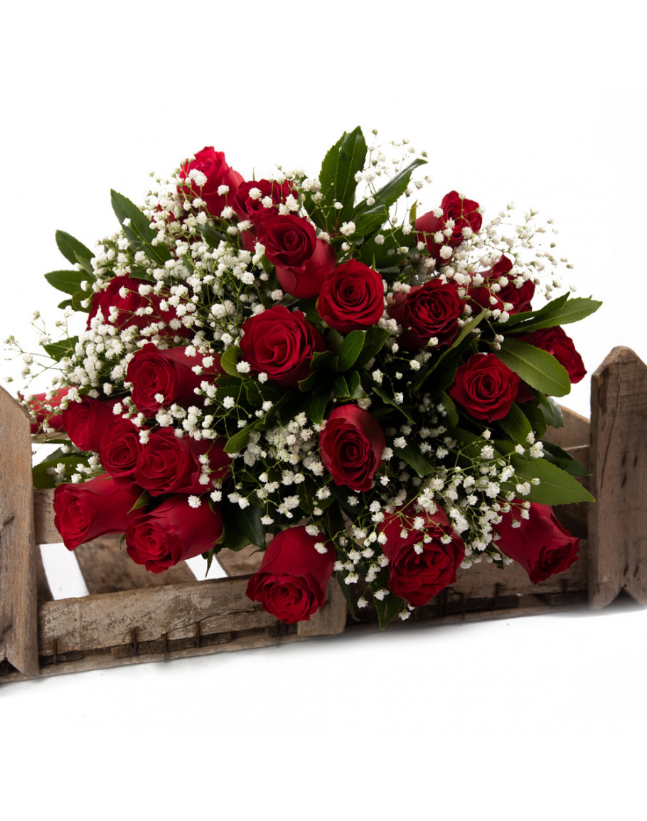 Μπουκέτο με 24 μεγάλα κόκκινα τριαντάφυλλα με πρασινάδες και ανθάκια αλλά και γυψοφίλη δώρο για μια μοναδική στιγμή όπως μια επέτειο ή για γενέθλια αλλά και φυσικά για την ημέρα του αγίου Βαλεντίνου.