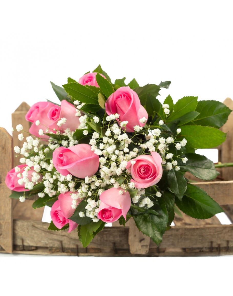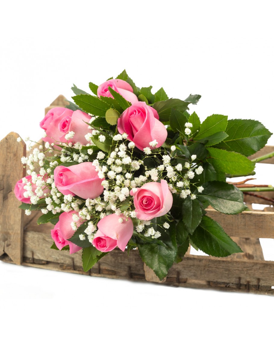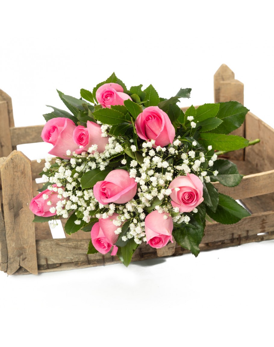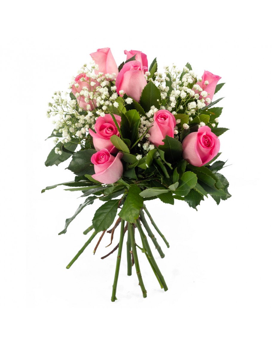 Μπουκέτο με 9 μεγάλα ροζ τριαντάφυλλα με πρασινάδες και ανθάκια αλλά και γυψοφίλη δώρο για μια μοναδική στιγμή όπως μια επέτειο ή για γενέθλια αλλά και φυσικά για την ημέρα του αγίου Βαλεντίνου.