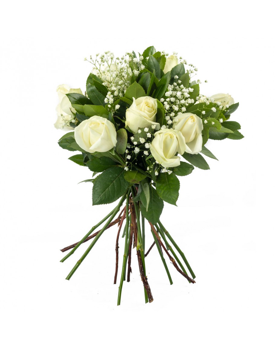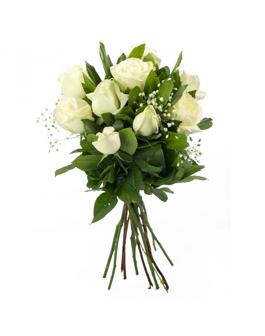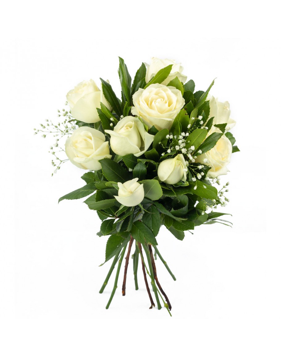 Μπουκέτο με 9 μεγάλα λευκά τριαντάφυλλα με πρασινάδες και ανθάκια αλλά και γυψοφίλη δώρο για μια μοναδική στιγμή όπως μια επέτειο ή για γενέθλια αλλά και φυσικά για την ημέρα του αγίου Βαλεντίνου.